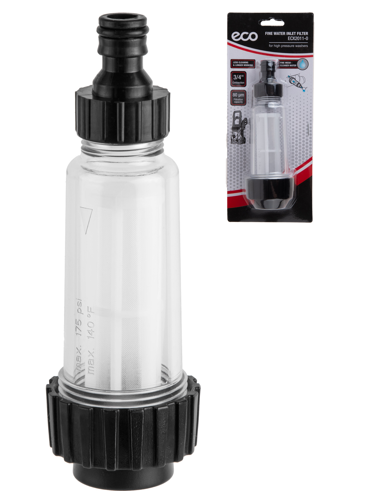 Назначение: за счет фильтрующего элемента очищает воду от механических примесей. Подсоединяется ко входному отверстию очистителя высокого давления.